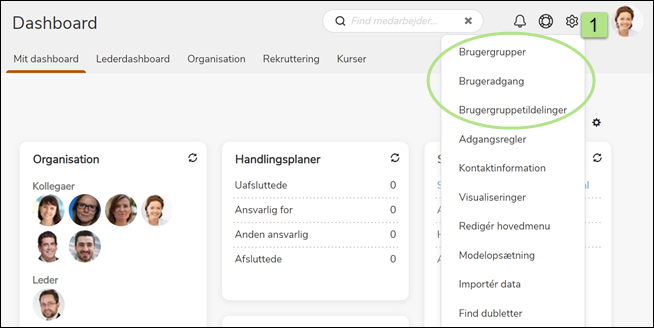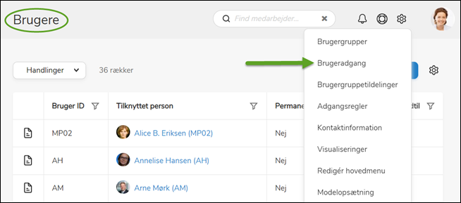 Det er muligt at få et samlet overblik over brugere, brugergrupper og tildelinger hertil samt adgangsregler fra menupunktet Indstillinger. Og herfra er det også muligt at administrere brugeradgange.