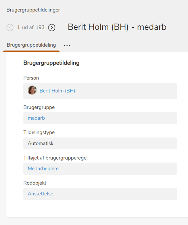 Detailvisningen viser her, at rodobjektet er den aktuelle ansættelse, som via rettighedsreglerne knytter personene til brugergruppen medarb.