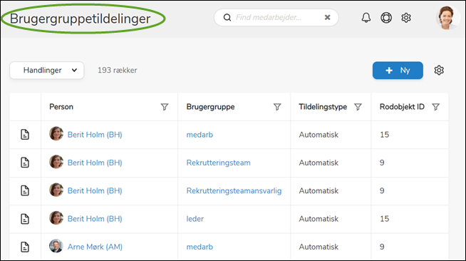 Menupunktet viser en oversigt over alle tildelinger til brugergrupper.Der er en linje for hver brugergruppetildeling. Dvs en medarbejder som Aksel Thomsen har pt. 5 brugergruppetildelinger. Af listen fremgår